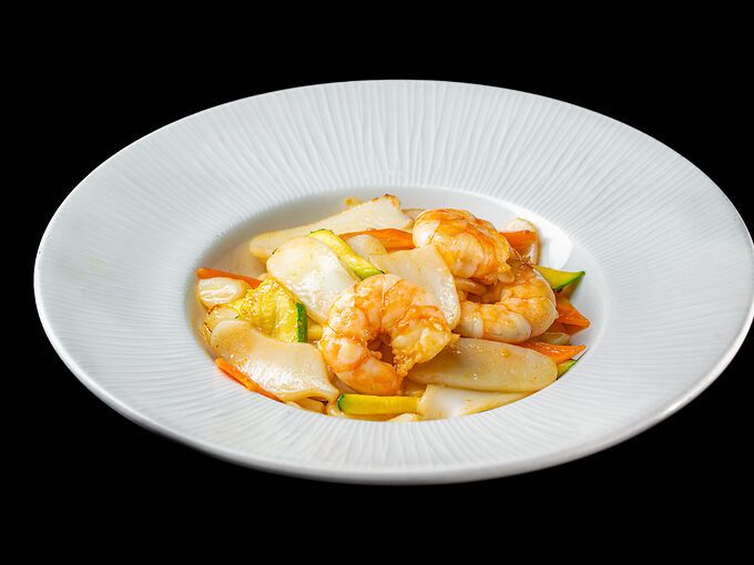 Gnocchi, gamberi, verdure miste