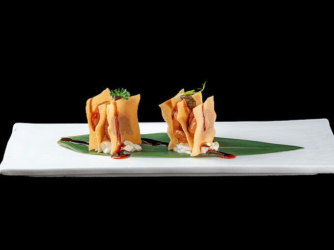 Involtino primavera con tonno crudo, philadelphia, tartufo e salsa teriyaki