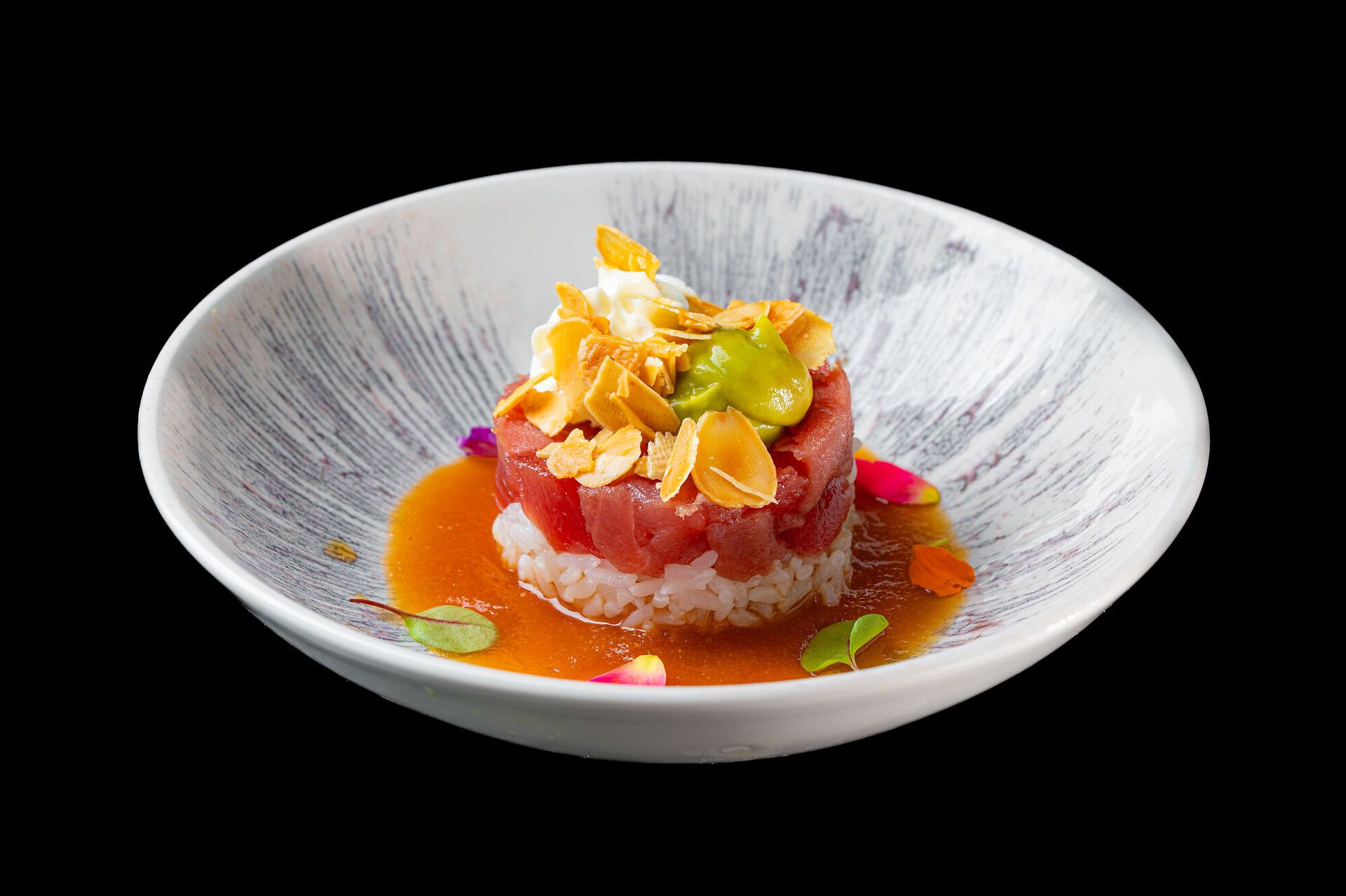 Tartare di tonno su riso bianco, philadelphia,sals avocado, salsa carote e mandole