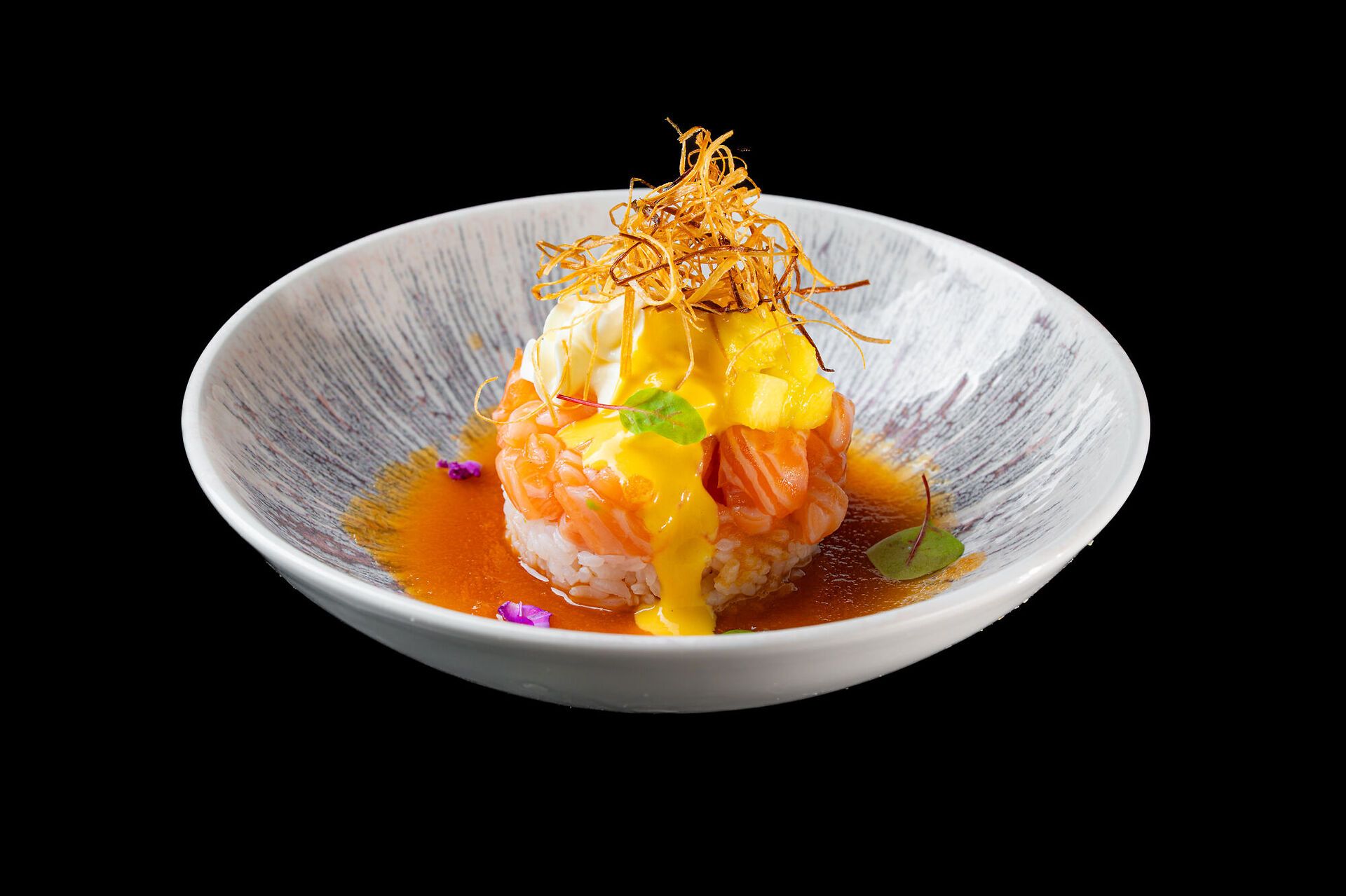 Tartare di salmone su riso bianco, mango, philadelphia, salsa mango, salsa carote e porri fritti