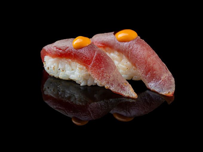 Nigiri con tonno scottato, salsa spicy e salsa teriyaki