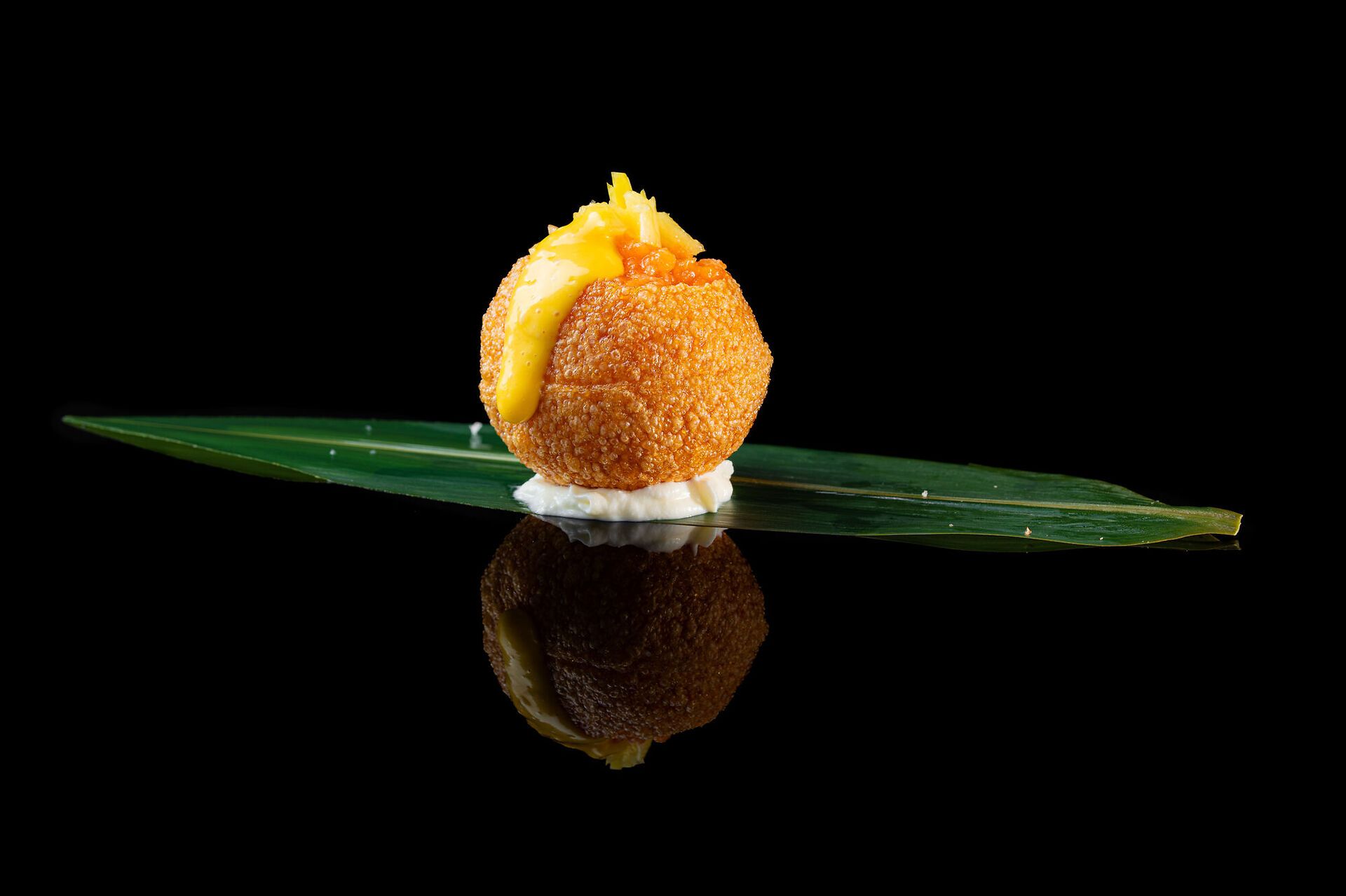 Sfere croccante indiane, tartare di salmone, mango e salsa mango (2 pz)