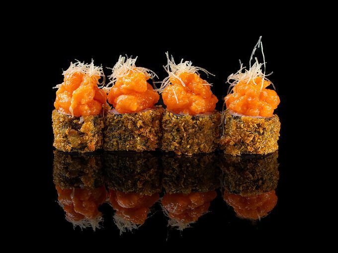 Salmone, tartare di salmone e salsa maio spicy, pangrattato e kataifi